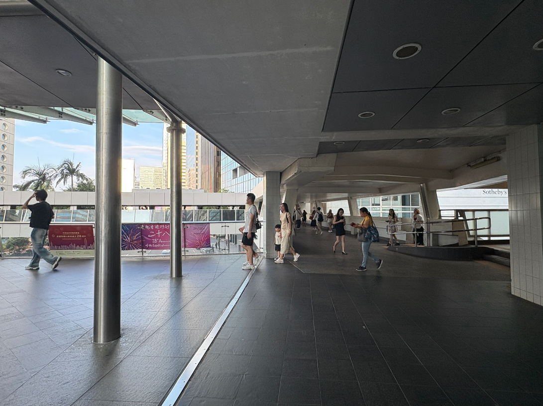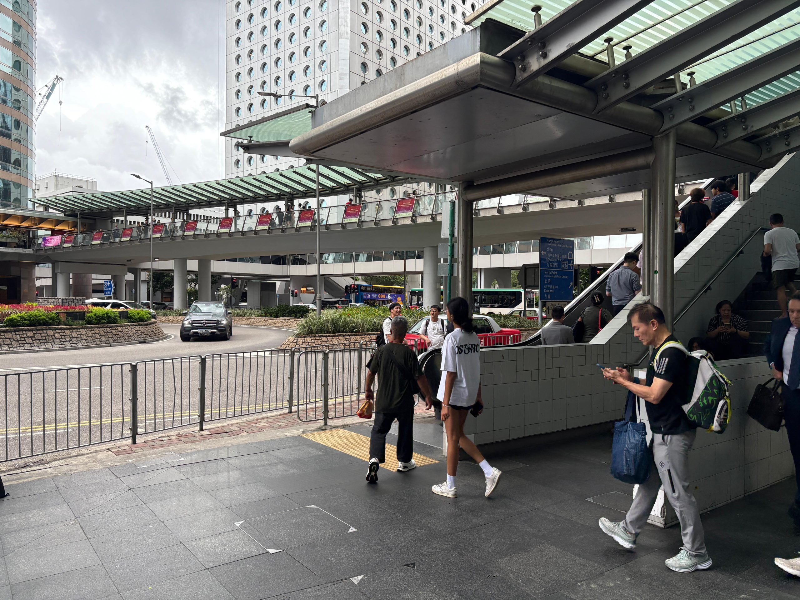 - After Arriving at Central Exit A, go to the adjacent escalator to the pedestrian bridge.